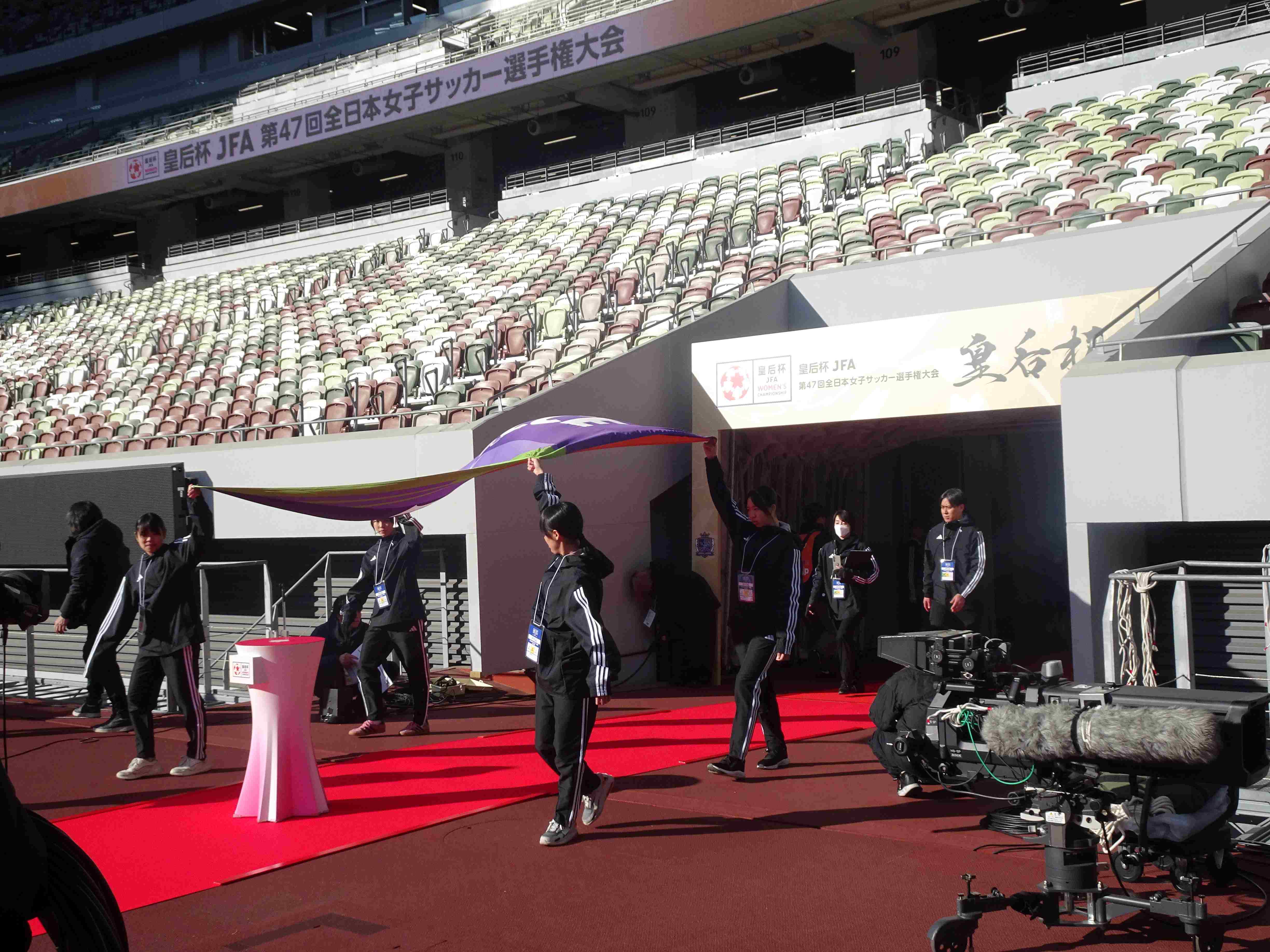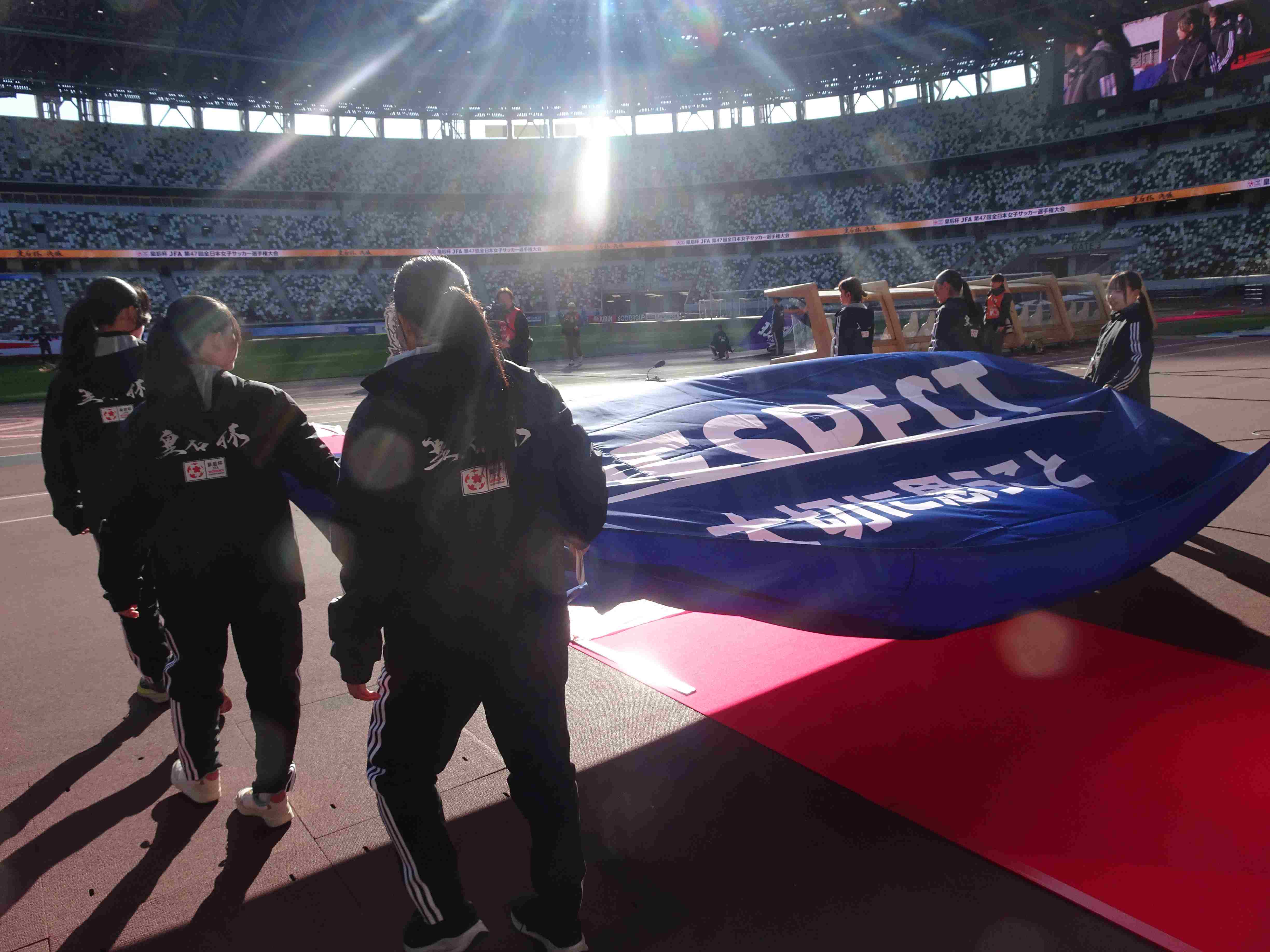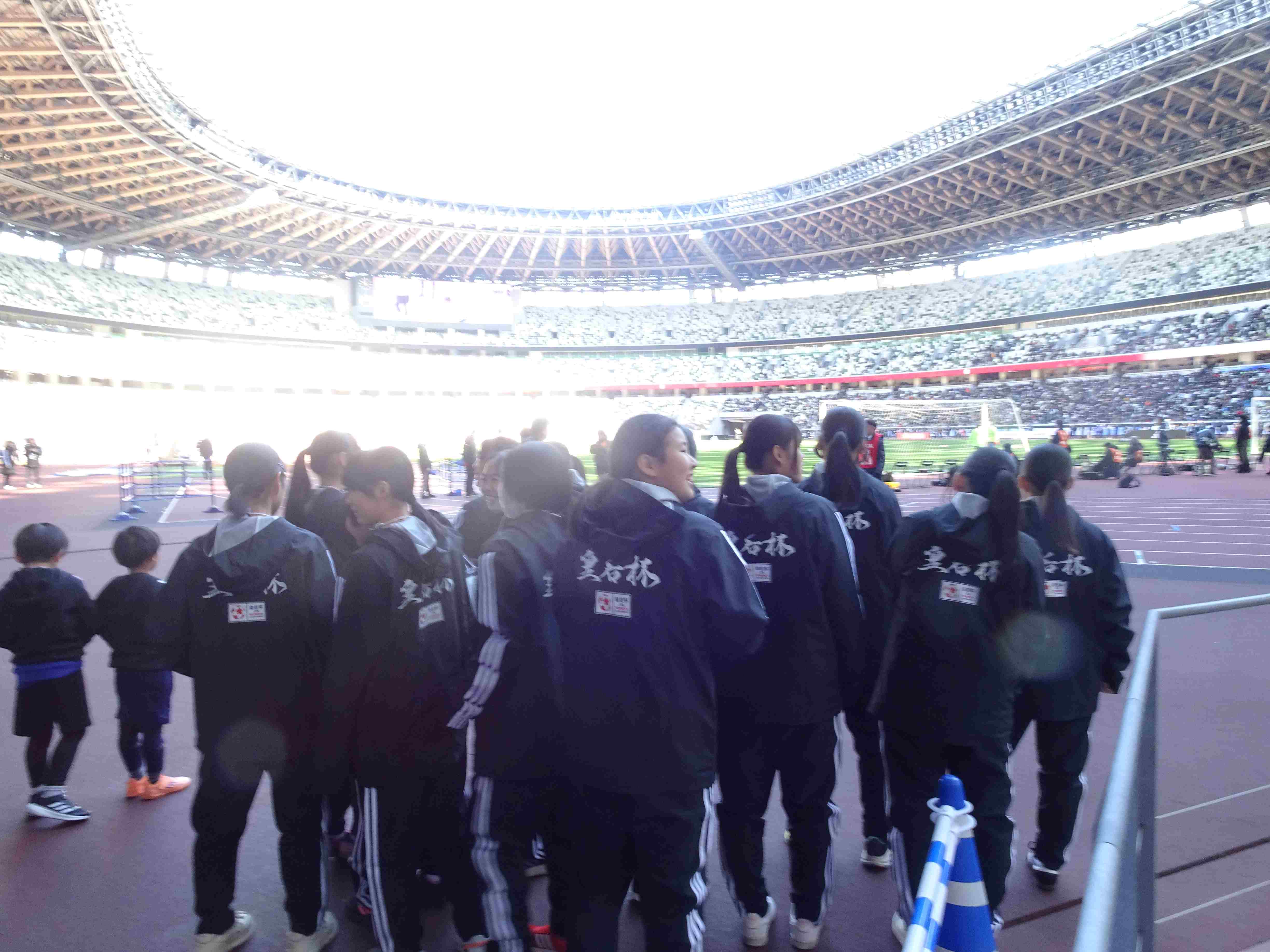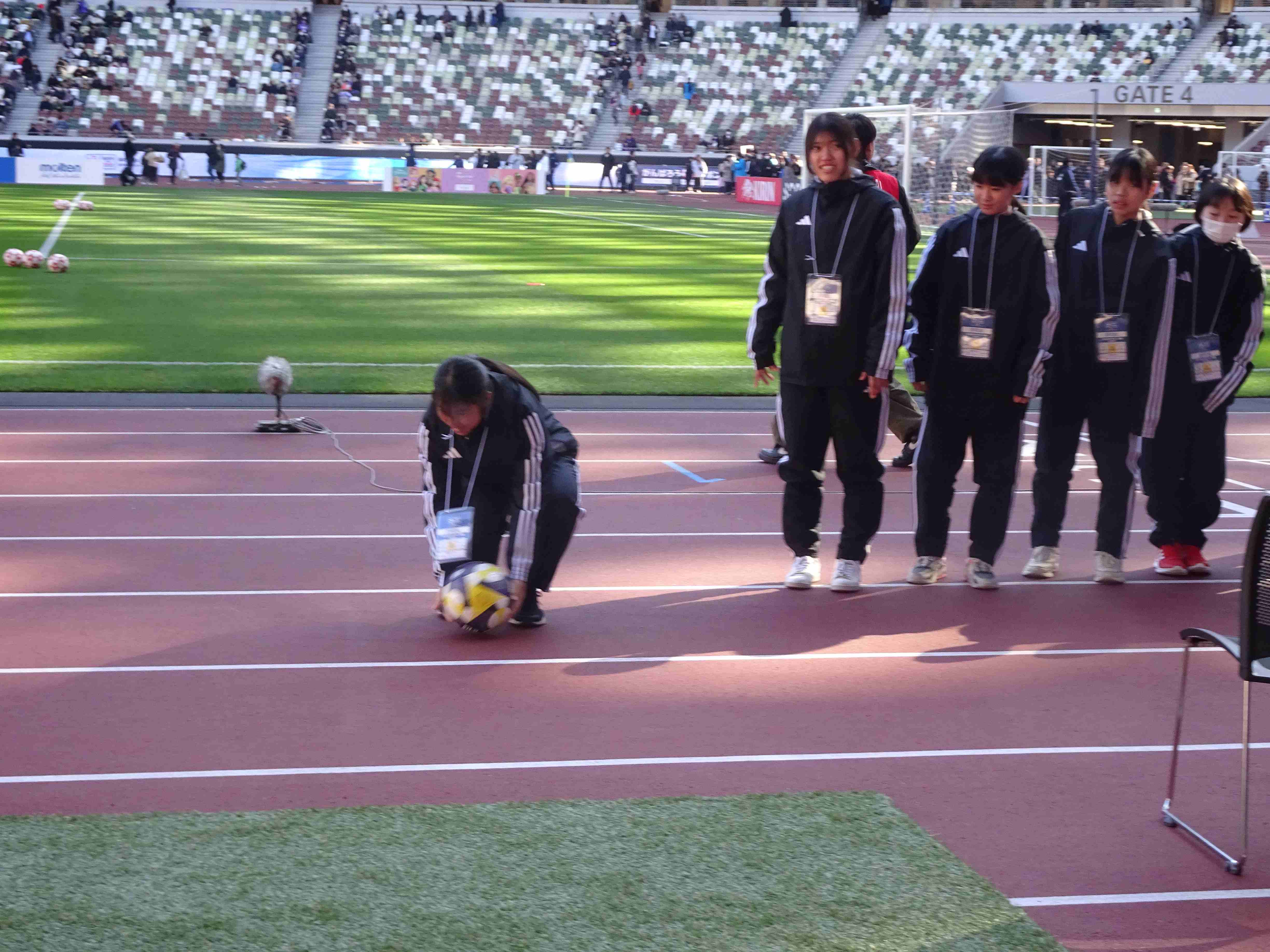 「元旦に皇后杯の決勝を国立でやるのですが、先生のところで、ボールパーソンと担架を出せませんか?」と、東京都サッカー協会女子連盟から依頼を受けた時、「1月1日でしょ?無理だと思うよ・・・せいぜい5人くらいかな。どこか別のチームにも声をかけて!」と、リアクションしました。しかし、予想に反して、17名(高2:6名 高1:5名 中学生:6名)もの選手が協力してくれるとのことに!テキパキ動き、適度な笑顔で明るく振る舞う選手たちに、「日本一を決める試合にふさわしい、最高のボールパーソンでした!」と、女子連盟の武藤先生から褒めていただき、とても嬉しく思えた元日でした。